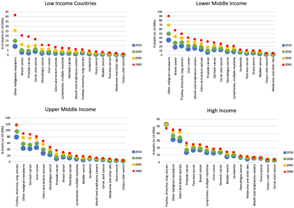 Number of deaths with serious health-related suffering according to cancer type, in low, lower-middle, upper-middle and high income countries. Number of deaths in 10,000s.