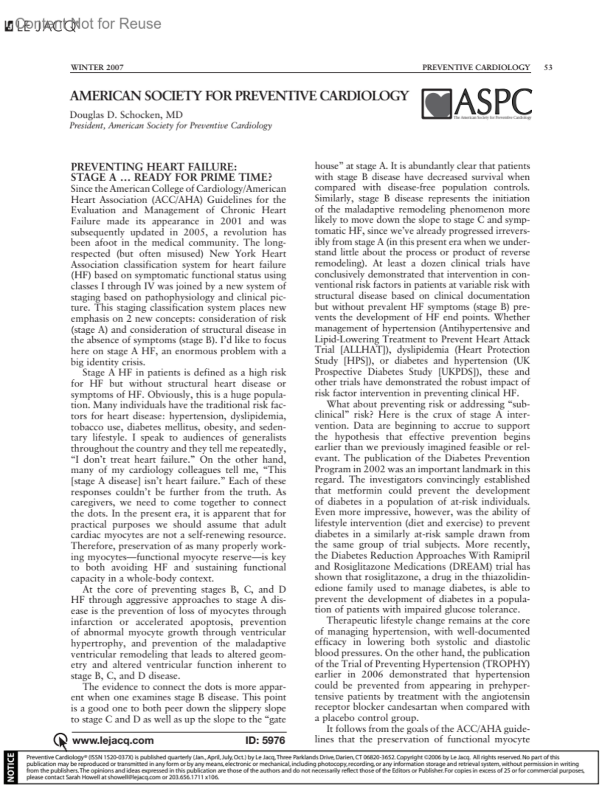PREVENTING HEART FAILURESTAGE A … READY FOR PRIME TIME?Schocken, Douglas D. MDAuthor informationPresident, American Society for Preventive CardiologyPreventive Cardiology 10(1):p 53-54, Winter 2007.Copyright © 2007 Blackwell Publishing Ltd.