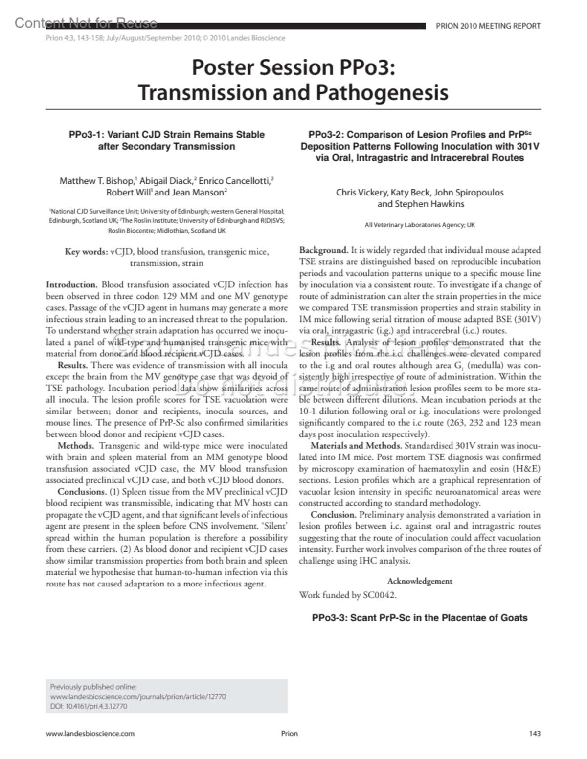 PPo3-3: Scant PrP-Sc in the Placentae of Goats with Naturally Acquired ScrapieO’Rourke, K. I.Schneider, D. A.Zhuang, D.Truscott, T.Author informationDepartment of Agriculture; USAPrion 4(3):p 143-144, July-August-September 2010.Copyright © 2010 Landes Bioscience
