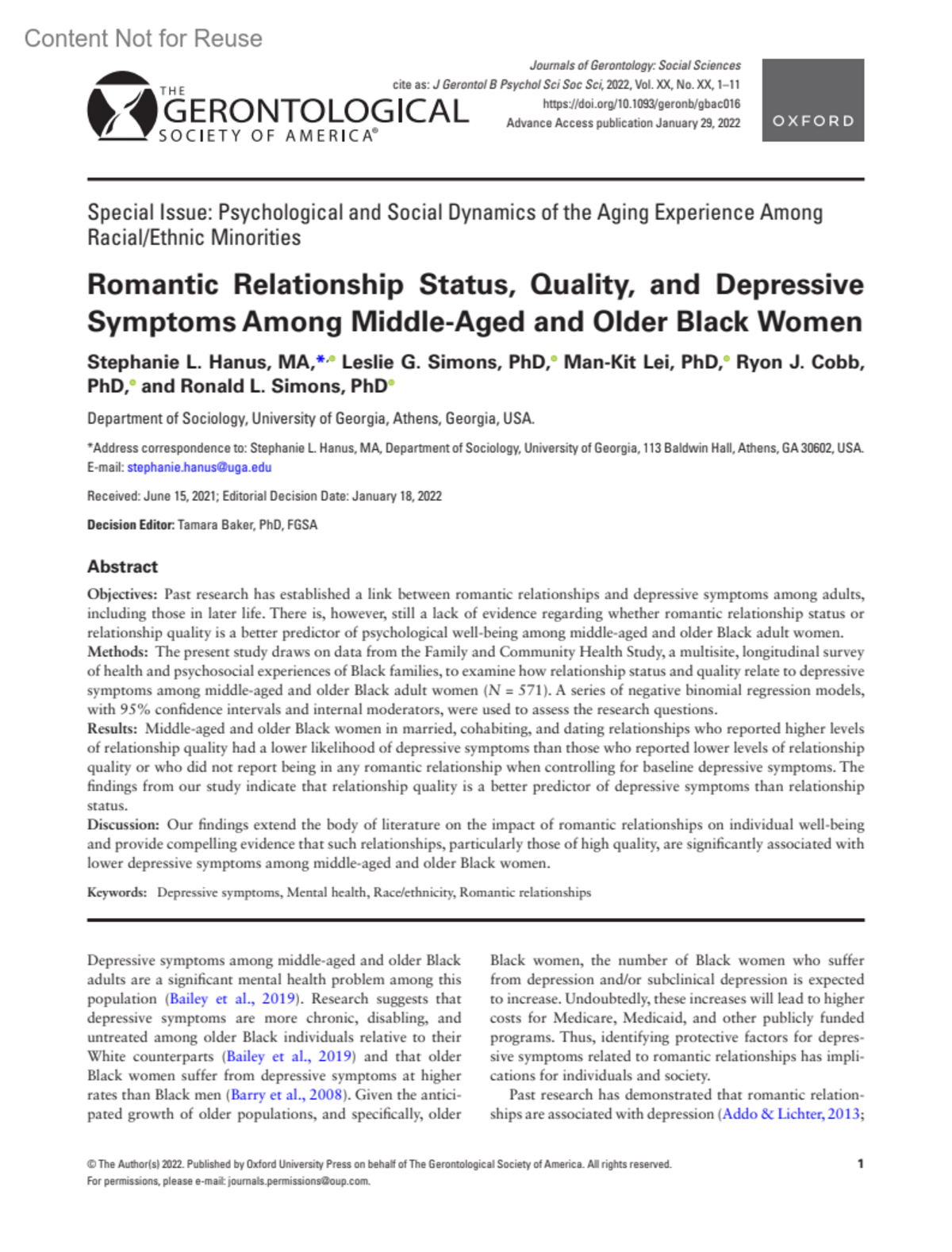 Romantic Relationship Status, Quality, and Depressive Symptoms Among Middle-Aged and Older Black Women