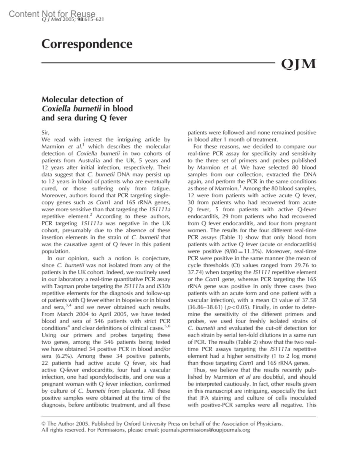 Molecular detection of Coxiella burnetii in blood and sera during Q fever