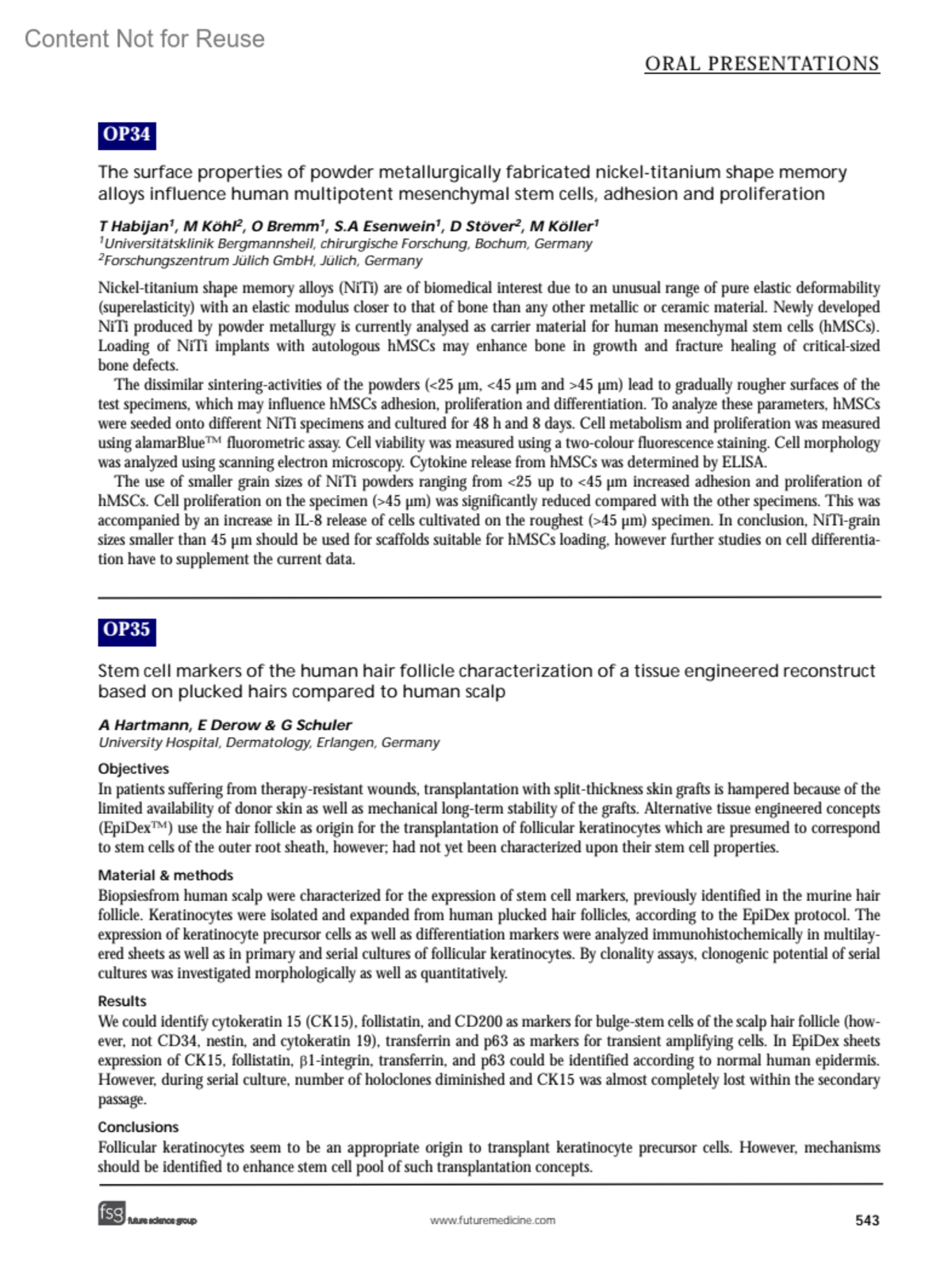 Stem cell markers of the human hair follicle characterization of a tissue engineered reconstruct based on plucked hairs compared to human scalp