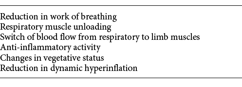 Other mechanisms may work. Assisted ventilation may prevent the inflammatory response to exercise in patients with COPD and muscle wasting [] and influence some endogenous factors in healthy people []. Furthermore, NIV may reduce the sympathetic activation during exercise with positive effects on the cardiovascular system as well as on muscle function [, ]. Nevertheless, there are no physiological studies in patients with CVF under long-term NIV. Table 1 summarises the potential mechanisms of NIV action during exercise.