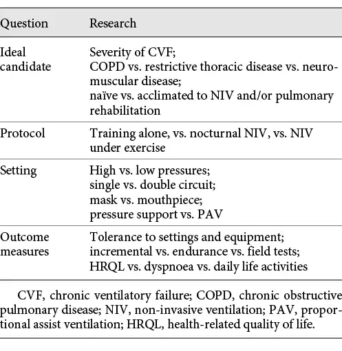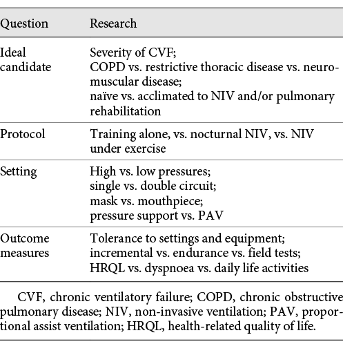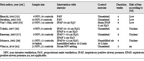 Exercise training has also been evaluated in a RCT in patients with kyphoscoliosis under NIV with beneficial effects on exercise capacity, muscle strength, dyspnoea and HRQL after 12 weeks []. In a RCT on a small sample size of patients with restrictive thoracic disease, home-based exercise training with NIV was effective and feasible [], confirming an old physiological small study []. A non-randomised study showed that an individually tailored pulmonary rehabilitation programme plus night-time NIV was feasible in hypercapnic patients with interstitial lung disease and significantly improved exercise capacity and HRQL [].