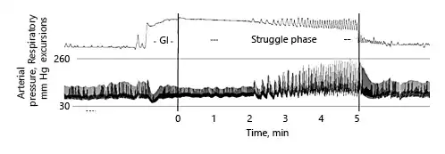 Easy-going and struggle phase during breath holding. Relatively early, the struggle phase starts with involuntary contractions of the thorax and diaphragm. In parallel, the arterial peak pressure increases up to values of 260 mm Hg. GI: glossopharyngeal insufflation. Reproduced with permission from Heusser et al. [].