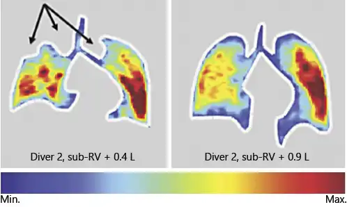 In a study on two elite BH divers, acute effects of GE were demonstrated using pulmonary Magnetic resonsnace imaging (MRI). After performing GE, and after the divers inhaled small volumes from sub-RVs, MRI demonstrated strikingly inhomogeneous inhalation patterns (Fig. 5), which were interpreted as the result of a reopening of frankly closed airways []. The question whether the airways reopen quickly enough during rapid ascent and prevent from insufficient gas exchange after surfacing remains unanswered.