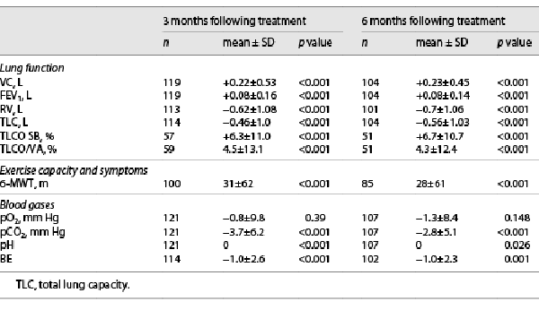 All lung function parameters, TLCO SB, TLCO/VA, and 6-MWT were significantly improved at 3- and 6-month FU (Table 2). At 3-month and 6-month FU, 40% and 38% of the patients met the efficacy threshold of greater than 15% improvement in FEV1, respectively. 54% and 52% of the patients experienced a greater than 25 m improvement on the 6-MWT 3 and 6 months following valve treatment, respectively.