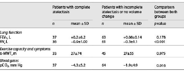Patients who developed a complete lobar atelectasis (n = 40) following the valve therapy experienced a superior hyperinflation reduction compared to patients with incomplete atelectasis (RV −0.92 L ± 1.01 L vs. −0.50 ± 1.1, p < 0.001). There was no significant difference in change of FEV1 (+0.1 L ± 0.1 L vs. +0.2 L ± 0.2 L, p = 0.178) or 6-MWT (+27 m ± 74 m vs. 27 m + 55 m, p = 0.975). In the subgroup of patients who developed a complete lobar atelectasis and thus a statistically significant RV reduction, a more pronounced pCO2 was found (pCO2 −4.3 mm Hg ± 5.2 mm Hg vs. −1.9 ± 4.9 mm Hg, p 0.016). Results are presented in Table 3.