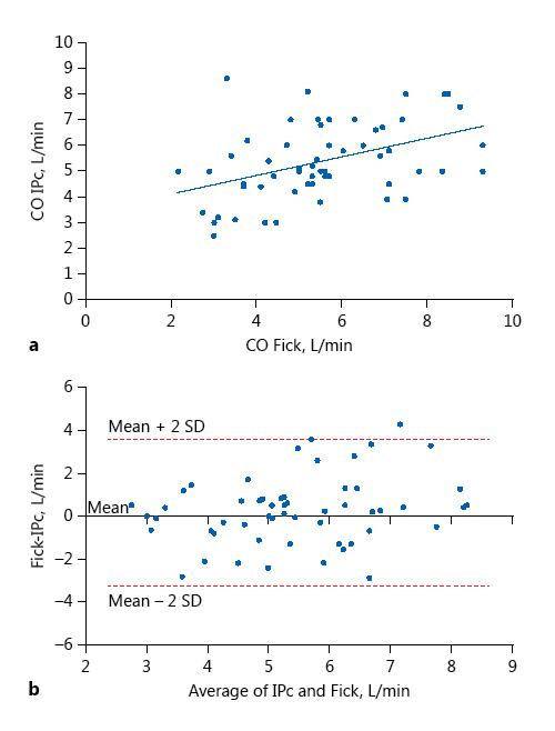 The mean CO measurements using IPc and the Fick method were 5.5 ± 1.7 and 5.7 ± 1.9 L/min, respectively. There was no difference between CO measurements using IPc and those using the direct Fick method (p = 0.524).