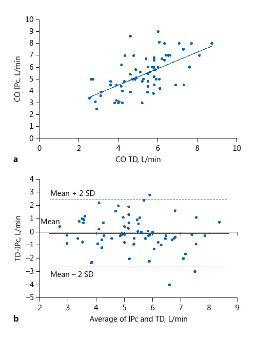 Relationship between cardiac output (CO) measured by impedance cardiography (IPc) and CO measured by thermodilution (TD). a Plot of CO measured by IPc versus TD. The regression equation is CO IPc = 1.7 + 0.7 × CO TD r = 0.365. b Bland-Altman plots of IPc and TD. The solid line represents the mean (–0.153 L/min) and the broken lines the 95% limits of agreement (–2.7 to 2.4).