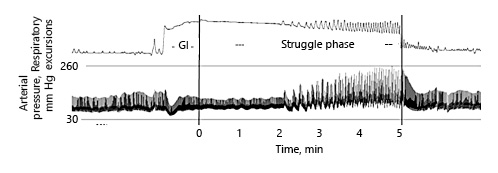 Easy-going and struggle phase during breath holding. Relatively early, the struggle phase starts with involuntary contractions of the thorax and diaphragm. In parallel, the arterial peak pressure increases up to values of 260 mm Hg. GI: glossopharyngeal insufflation. Reproduced with permission from Heusser et al. [].
