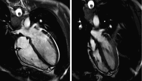 Glossopharyngeal insufflation (GI). End-diastolic four-chamber view (steady-state free precession MRI). Left: supine control. Right: after GI and 2-min apnea. Reproduced with permission from Schipke et al. [].