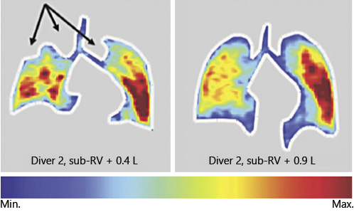 Inhalation of 0.4 L (left) and 0.9 L (right) from sub-RVs in a diver lead to drastic heterogeneous inhalation patterns. Arrows indicate atelectatic areas. Reproduced with permission from Muradyan et al. [].