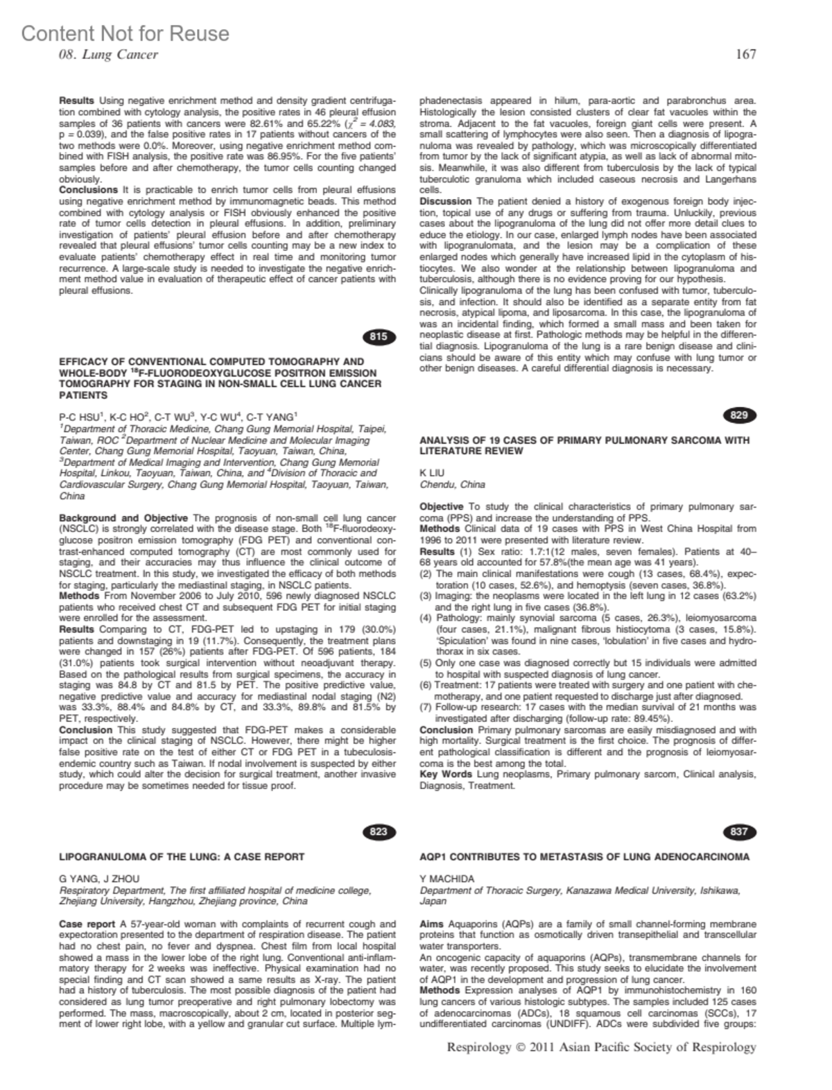 LIPOGRANULOMA OF THE LUNG: A CASE REPORT823YANG, GZHOU, JAuthor informationRespiratory Department, The first affiliated hospital of medicine college, Zhejiang University, Hangzhou, Zhejiang province, ChinaRespirology 16:p 167, November 2011.Copyright © 2011 Blackwell Publishing Ltd.