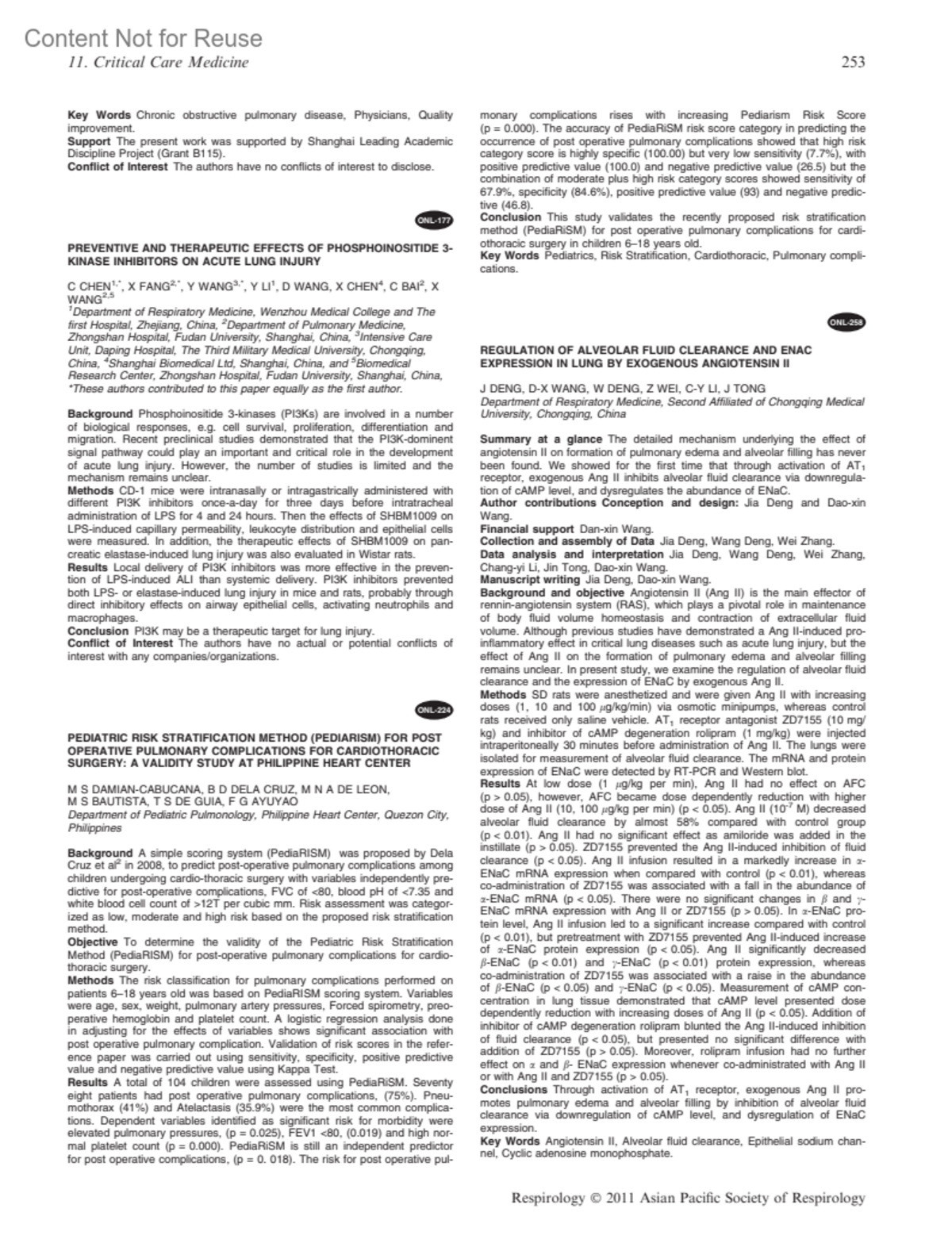 REGULATION OF ALVEOLAR FLUID CLEARANCE AND ENAC EXPRESSION IN LUNG BY EXOGENOUS ANGIOTENSIN IIONL-258DENG, JWANG, D-XDENG, WWEI, ZLI, C-YTONG, JAuthor informationDepartment of Respiratory Medicine, Second Affiliated of Chongqing Medical University, Chongqing, ChinaRespirology 16:p 253, November 2011.Copyright © 2011 Blackwell Publishing Ltd.