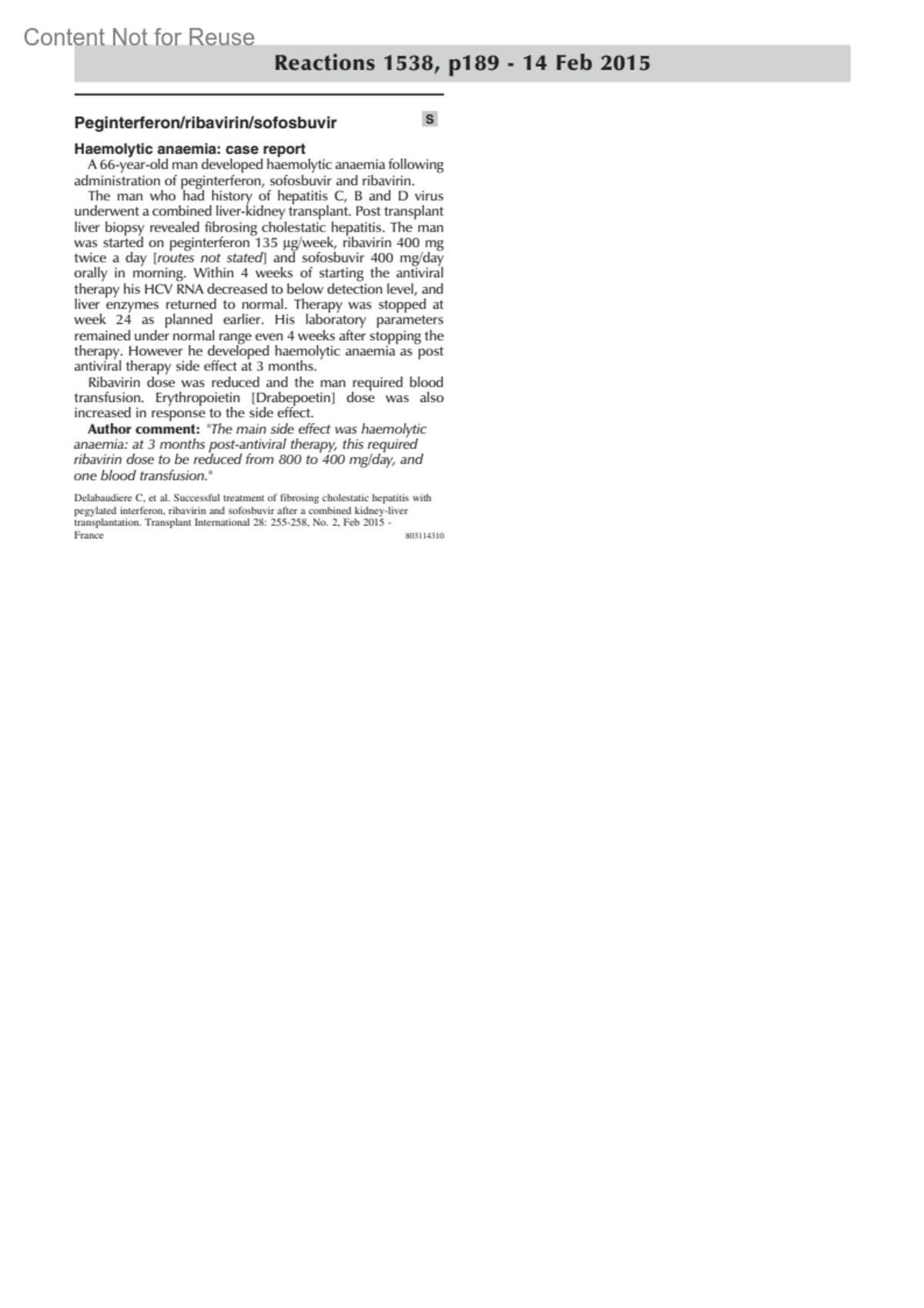 Peginterferon/ribavirin/sofosbuvirHaemolytic anaemia: case reportAuthor informationPublished online: 14 February 2015Reactions Weekly (1538):p 189, February 2015. | DOI: 10.1007/s40278-015-7493-zCopyright © Springer International Publishing Switzerland 2015