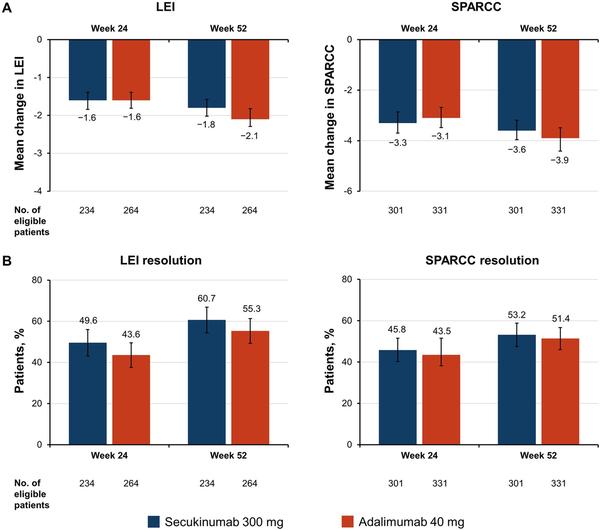 Both secukinumab and adalimumab resulted in similar improvements in enthesitis as measured by the mean change from baseline in LEI and SPARCC enthesitis counts at weeks 24 and 52 (Fig. 1A). At week 24, mean (S.D.) change from baseline in LEI and SPARCC enthesitis counts for patients receiving secukinumab was −1.6 (1.6) and −3.3 (3.5), respectively; LEI and SPARCC improvement from baseline for patients receiving adalimumab was −1.6 (1.6) and −3.1 (3.5), respectively. These improvements were sustained through week 52, when mean (S.D.) change from baseline in LEI and SPARCC enthesitis counts for patients receiving secukinumab was −1.8 (1.6) and −3.6 (3.2), respectively; LEI and SPARCC improvement for patients receiving adalimumab was −2.1 (1.7) and −3.9 (3.8), respectively. Similar proportions of patients in both treatment groups achieved resolution of LEI and SPARCC at weeks 24 and 52 (Fig. 1B). By week 24, 49.6% and 45.8% of patients receiving secukinumab and 43.6% and 43.5% of patients receiving adalimumab achieved resolution of LEI and SPARCC enthesitis, respectively. These results were extended through week 52, when 60.7% and 53.2% of patients receiving secukinumab and 55.3% and 51.4% of patients receiving adalimumab achieved resolution of LEI and SPARCC enthesitis, respectively. Additionally, change from baseline in number of affected entheses by visit followed similar trajectories for patients receiving either drug (Supplementary Fig. S1, available at Rheumatology online).