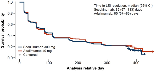 Kaplan–Meier estimate of time to first resolution of LEI enthesitis up to week 52. LEI: Leeds Enthesitis Index