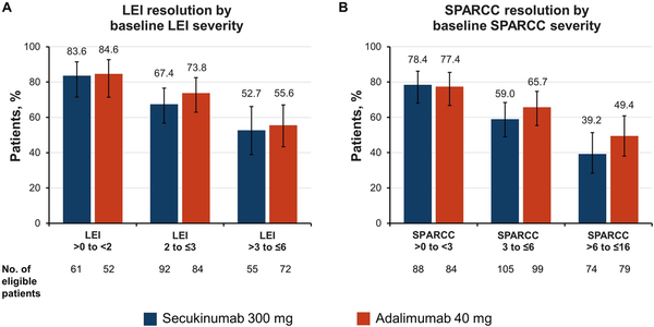 Proportion of patients achieving resolution of enthesitis at week 52 by baseline (A) LEI and (B) SPARCC enthesitis severity. Error bars represent 95% CIs. LEI: Leeds Enthesitis Index; SPARCC: Spondyloarthritis Research Consortium of Canada Enthesitis Index