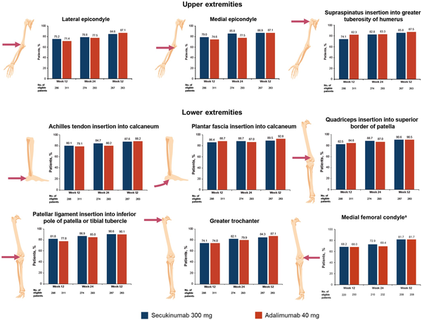 Secukinumab and adalimumab led to similar achievement of enthesitis resolution overall and at individual sites.