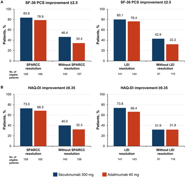 Achievement of (A) SF-36 PCS improvement ≥2.5 and (B) HAQ-DI improvement ≥0.35 by enthesitis status at week 52. HAQ-DI, HAQ-Disability Index; LEI: Leeds Enthesitis Index; PCS, physical component summary; SF-36, 36-Item Short Form Health Survey; SPARCC, Spondyloarthritis Research Consortium of Canada Enthesitis Index