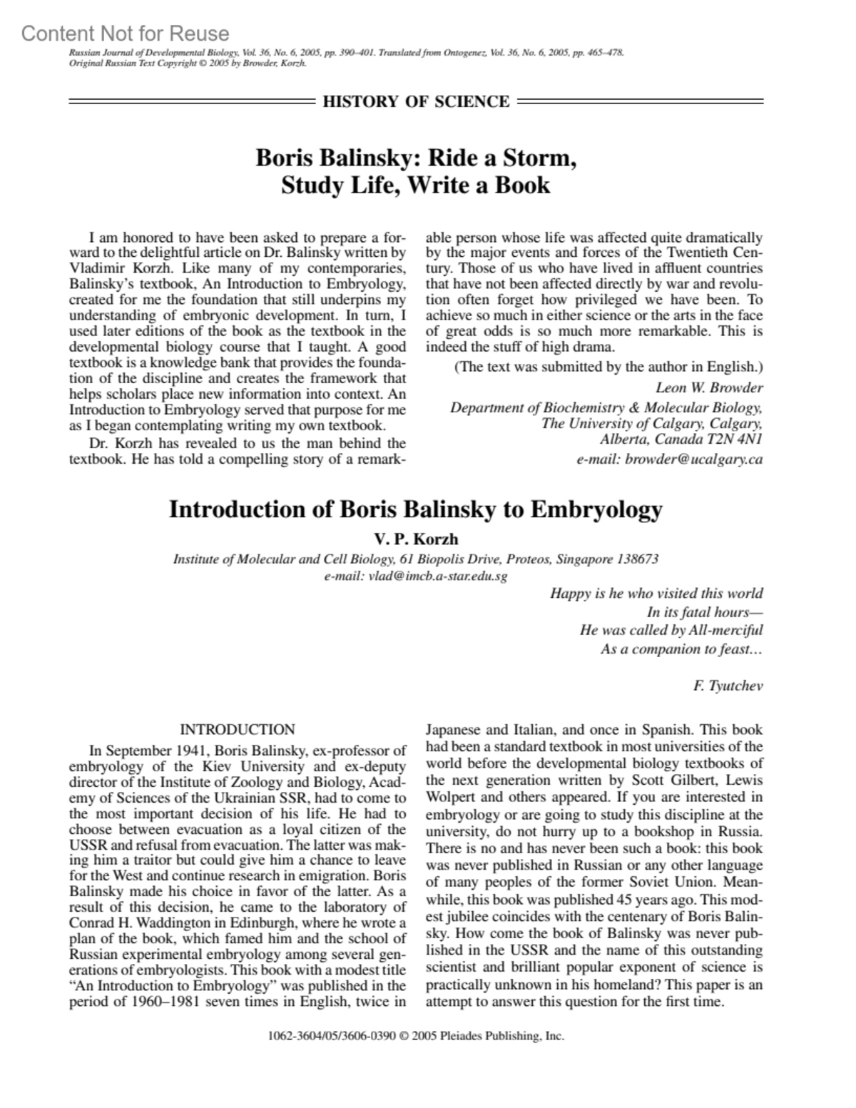 Boris BalinskyRide a Storm, Study Life, Write a BookBrowder, Leon W.Author informationDepartment of Biochemistry & Molecular Biology, The University of Calgary, Calgary, Alberta, Canada T2N 4N1 e-mail: [email protected]Russian Journal of Developmental Biology 36(6):p 390, November 2005.Copyright ©2005 Kluwer Academic Publishers