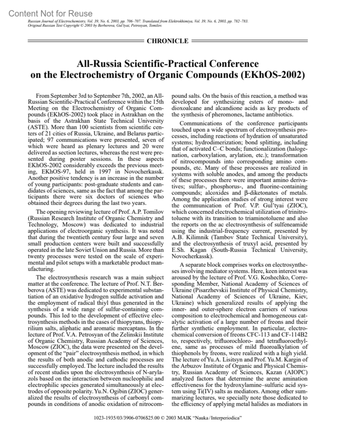 All-Russia Scientific-Practical Conference on the Electrochemistry of Organic Compounds (EKhOS-2002)
