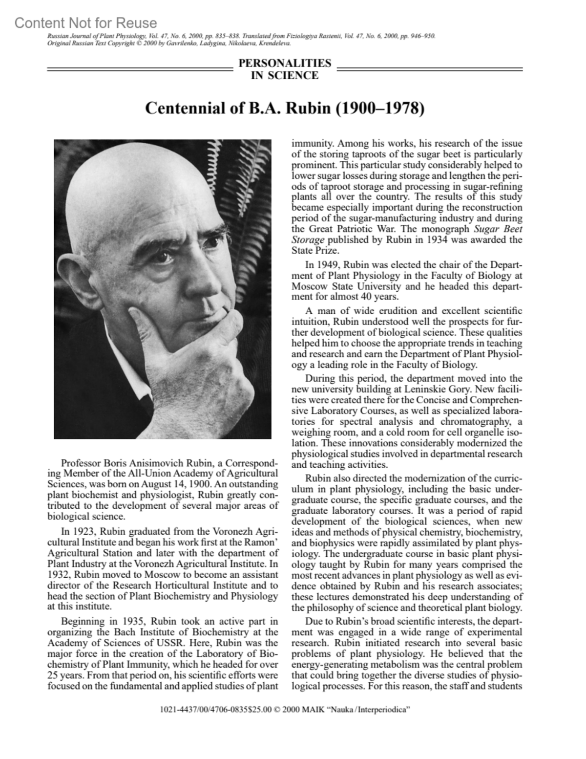 Centennial of B.A. Rubin (1900–1978)Gavrilenko, V. F.Ladygina, M. E.Nikolaeva, L. F.Krendeleva, T. E.Russian Journal of Plant Physiology 47(6):p 835-838, November-December 2000.Copyright ©2000 Kluwer Academic Publishers