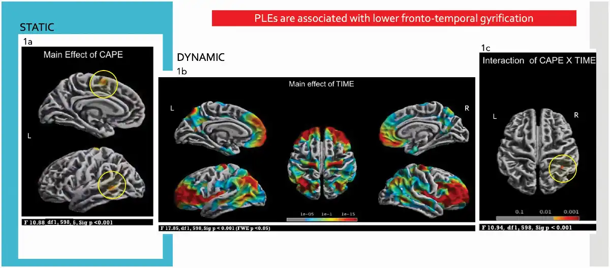 2) Adolescents with PLEs, with high CAPE scores, would show a neurodevelopmental abnormality as evidenced by persistently altered frontal and temporoparietal static cortical gyrification from baseline to follow-up compared to adolescents without PLEs.