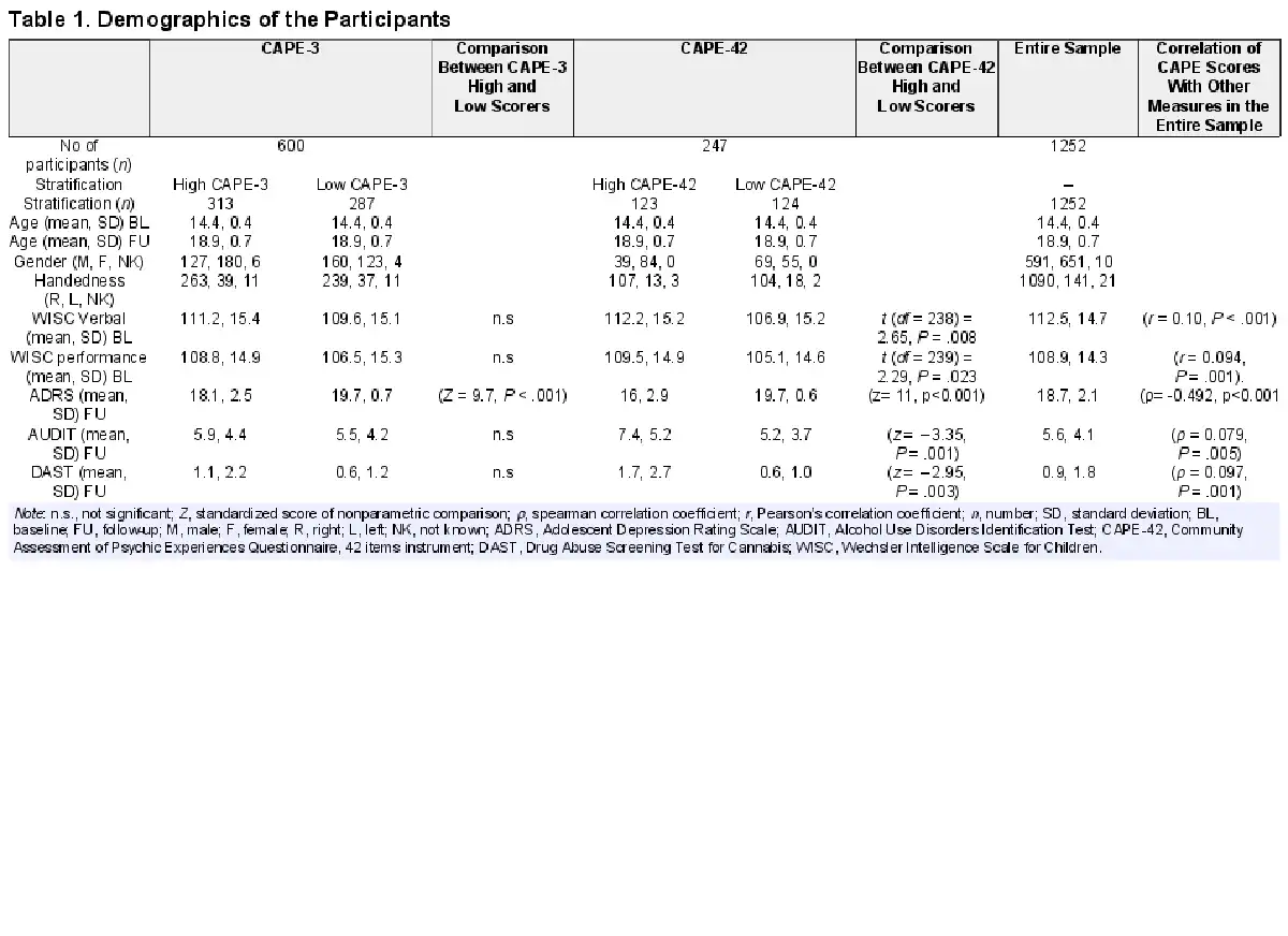 Demographics for each sample stratification are available in Table 1. Briefly, for the CAPE-3 sample stratification there was a total sample of 600 adolescents with 313 high CAPE-3 scorers and 287 low CAPE-3 scorers. There were no significant differences in age, IQ (WISC IV), alcohol use (AUDIT), and cannabis use (DAST) scores between the high and low CAPE-3 scorers. Only the ADRS scores differed between the 2 groups (Z = 9.7, P < .001) where low CAPE-3 scorers displayed higher depressive symptoms than high CAPE-3 scorers.
