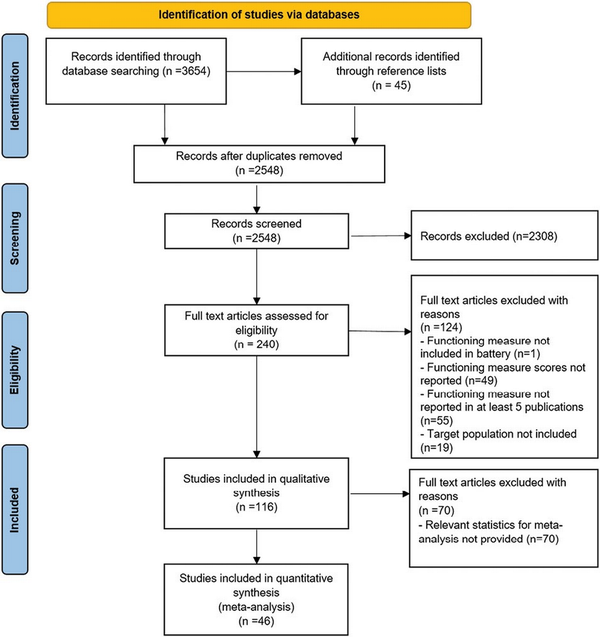 Titles and abstracts of articles were screened, following which full-text articles were assessed for eligibility for inclusion in the systematic review and subsequent meta-analyses by 3 independent reviewers (T.W., E.G., and M.C.). Data were extracted for functioning measures, as well as study and participant characteristics (follow-up length, age, percent male, diagnoses, medication use, study setting/service). Discrepancies were resolved by consensus (T.W., E.G., M.C., and G.D.). A record of reasons for exclusion was maintained at each step of the review process (identification, screening, and eligibility assessment). Throughout the review, data were recorded and maintained (T.W., E.G., and M.C.) in standardized data extraction spreadsheets for measure scores/statistics, study/participant characteristics, and for quality assessment checklists.