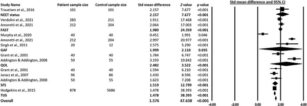 Nine cross-sectional studies reported relevant data for patient and healthy control group comparisons (see figure 2). The overall effect size was large (SMD = 1.576, 95% CI [1.511–1.641], P < .001), indicating that measures are generally able to detect differences in functioning between patients and healthy controls. Across the measures included, SMDs ranged from 1.478 to 2.482. For individual measures, the largest effect sizes were observed for QOL (SMD = 2.482, 95% CI [1.101–3.864], P < .001) and NEET status (mean difference = 2.157, 95% CI [1.607–2.708], P < .001), although the limited number of studies involved (2 QOL studies and 1 NEET status study were included) prevented definite conclusions being drawn about these analyses.