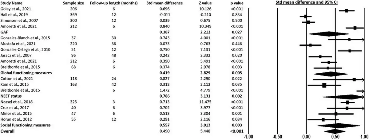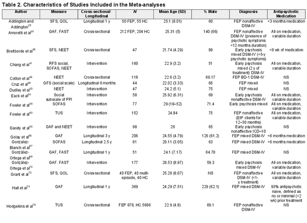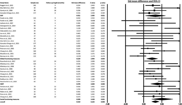 A limitation of this review was the limited number of studies available for inclusion in our meta-analyses. In addition, significant heterogeneity was noted across studies, likely reflecting variability in terms of sample size, length of follow-up, and outcome measures. We conducted subgroup and meta-regression analyses to account for this variability and to evaluate the effect the type of functioning measure has on effect sizes when controlling for possible confounding variables. A significant percentage of studies did not provide adequate information to allow inclusion in meta-analysis. In most cases, this was due to the inclusion of the functioning measure as a secondary outcome that was not the focus of the analysis, and therefore studies did not report relevant scores and statistics required for our meta-analysis, reflecting a previous lack of focus on social and occupational focus in the literature. There was also an absence of an adequate assessment of the psychometric properties of existing measures, with scarce data available on their validity, reliability, responsiveness, and sensitivity in early psychosis. This meant we were unable to compare different measures based on validity and reliability statistics. In addition, data were collected on outpatients rather than inpatients. There was a wide variation in definitions of FEP. Definitions varied in terms of whether they were based on first treatment contact, duration of antipsychotic medication use, or duration of psychosis. This is further complicated by issues regarding disparities in illness identification as a function of racialized identity and access to care. Significant publication bias was noted for intervention studies likely due to the issue of reporting bias for nonsignificant findings in the literature for interventions. Our search was limited to articles published up to March 2021, as a result we may have missed more recent findings published in the last 2 years. However, given the large amount of data considered from studies conducted over a 21-year timeframe, we believe our findings sufficiently represent the existing literature and address an important issue in this field of research.