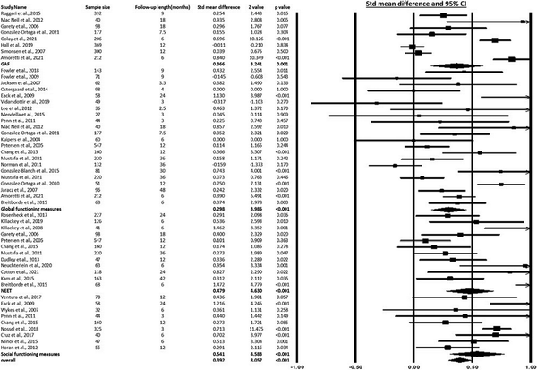 For comparison between measures, a series of subgroup analyses were conducted separately for measures most widely used—ie, the GAF, NEET status (considered as a group), other global assessments of social and occupational functioning (considered as a group) and specific measures of social function (considered as a group). Of the measures most frequently used, the global measures group (SMD = 0.229, 95% CI [0.079–0.379], P = .003) and the GAF (SMD = 0.321, 95% CI [0.048–0.594], P = .021) showed the smallest effect sizes for change in function. Specific measures of social function showed the largest effect size (SMD = 0.509, 95% CI [0.219–0.799], P = .001). Notably, among the brief measures considered, NEET status (SMD = 0.378, 95% CI [0.193–0.563], P < .001) showed larger effect sizes than longer, more global measures of social and occupational functioning. For global measures, we re-analyzed the group for studies that included the SOFAS as a separate group from other global measures, given this was included in 6 studies. When this was analyzed as a separate group, the effect size for the global group remained relatively similar (SMD = 0.241, 95% CI [0.041 to 0.441], P = .018), however the effect size for the SOFAS measure was nonsignificant (SMD = 0.215, 95% CI [−0.023 to 0.452], P = .077).