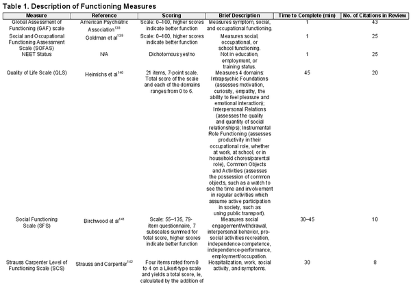This study provided a systematic review and meta-analysis of measures of functioning most widely employed in early psychosis research. The aim of the review was to (1) gather information about the measures most frequently used in the literature, and (2) quantitatively assess available measures in terms of the effect sizes for differences or changes in function. The limited consensus on measurement approach is reflected in the wide variation of published measures, with 36 different measures identified in our search.