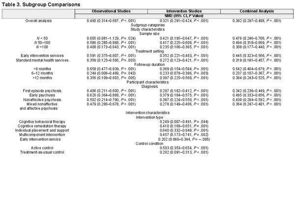 We carried out subgroup comparisons to consider the effects of potential confounding variables on the effect sizes calculated, including study characteristics (length of follow-up, sample size, treatment setting), participant characteristics (diagnosis: FEP vs early psychosis, and nonaffective psychosis vs mixed diagnosis), intervention type and control condition (for intervention studies only). Subgroup comparisons were carried out separately for observational studies and for interventional studies, and also for all studies combined (see table 3).