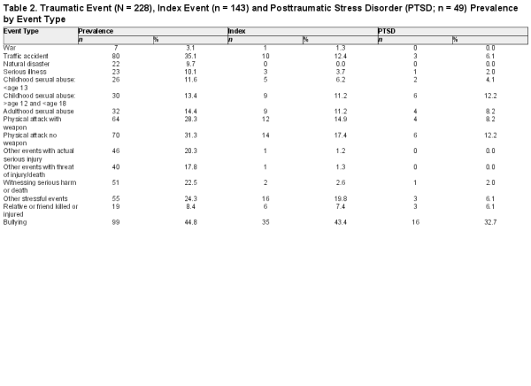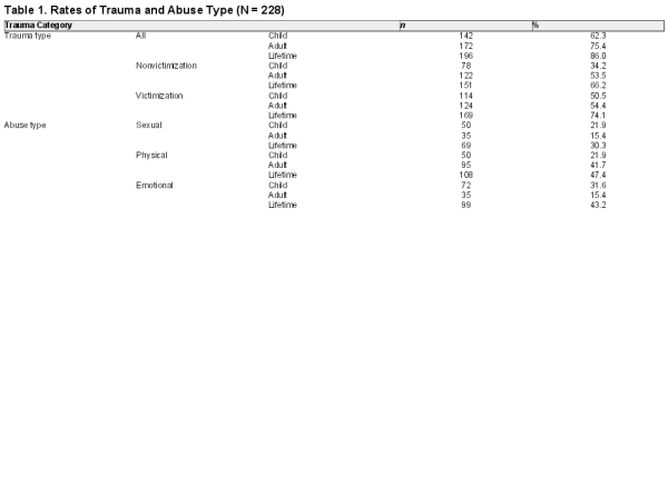 The rates of trauma types reported by the sample are shown in table 1. The majority of the sample reported experiencing a lifetime trauma (86.0%), with most reporting at least 1 lifetime victimization event (74.1%) and two-thirds reporting a lifetime nonvictimization event (66.2%). The mean number of traumatic events reported was 2.92 (SD = 2.12, range 0–10). A fifth of the sample reported childhood sexual abuse or childhood physical abuse, and a third described experiencing childhood emotional abuse. Just under a fifth of the sample reported adulthood sexual abuse or adulthood emotional abuse, whereas 40% indicated experiences of adulthood physical abuse. Overall, approximately half of the sample experienced lifetime physical abuse and lifetime emotional abuse, and just under a third lifetime sexual abuse. The rates of individual traumatic events, index traumas, and symptom criteria for PTSD are shown in table 2. The most common events were bullying, road traffic accidents then physical attacks. One hundred twenty-four participants (54.4%) reported an index trauma (ie, an event they were still currently affected by), with bullying, other stressful events, and physical attacks being most frequent. Symptom criteria for PTSD were met by 49 participants (21.5%), and were most likely to be associated with bullying, physical attacks then childhood sexual abuse.