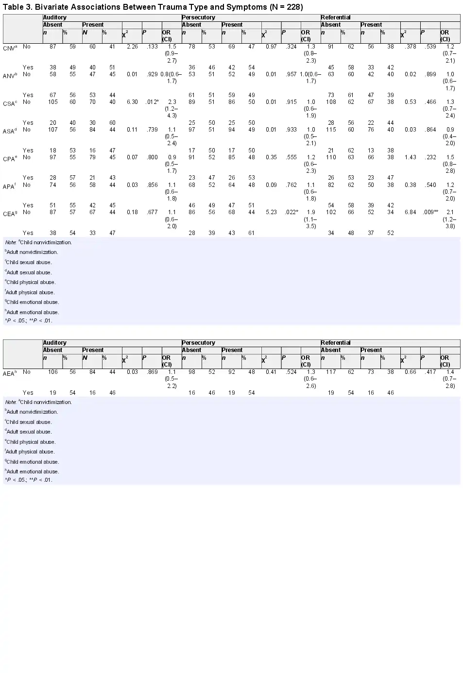 The associations between trauma types and psychotic symptoms are shown in table 3. Consistent with our first hypothesis, there was a significant association between childhood sexual abuse and auditory hallucinations. However, our second hypothesis was not supported, as there was no association between childhood physical abuse and paranoia. In contrast, childhood emotional abuse was associated with persecutory beliefs and delusions of reference. These associations remained significant after adjusting for age, gender, and ethnicity, with OR ranging from 2.21 to 2.43 (supplementary table 1). No other significant associations between trauma type, auditory hallucinations, persecutory, and referential delusions were identified. There were also no significant effects of combined trauma types or cumulative trauma on symptoms (supplementary table 2).
