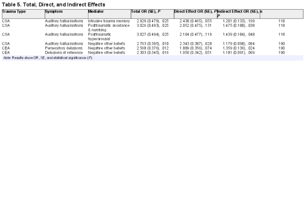 Table 5 shows the results of the mediation analysis. The total effect of childhood sexual abuse on auditory hallucinations had an OR of 2.929 (SE = 0.479, P = .025), which decomposed into a natural direct effect of 2.438 (SE = 0.465, P = .055) and a natural indirect effect of 1.201 (SE = 0.133, P = .169). The indirect effect was not statistically significant, indicating that there was no mediation through intrusive trauma memory.