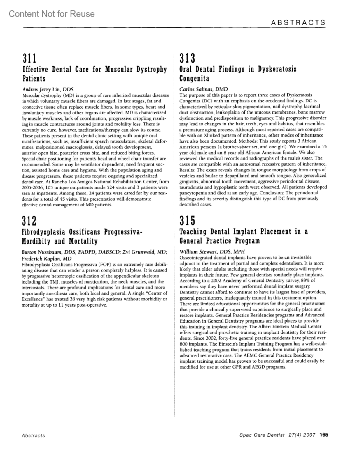 Oral Dental Findings in Dyskeratosis Congenita313Salinas, Carlos DMDSpecial Care In Dentistry 27(4):p 165, July 2007.Copyright © 2007 John Wiley & Sons, Inc.