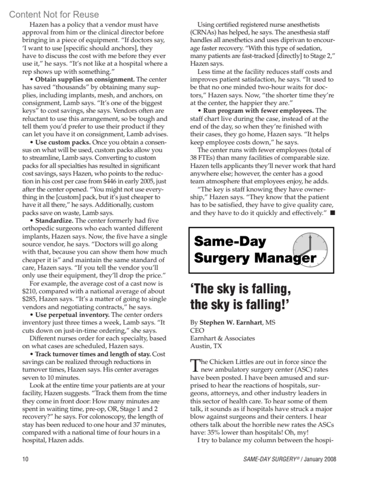 ‘The sky is falling, the sky is falling!’Earnhart, Stephen W. MS CEOAuthor informationEarnhart & AssociatesAustin, TXSame-Day Surgery 32(1):p 10-12, January 2008.Copyright © 2008 AHC Media LLC.