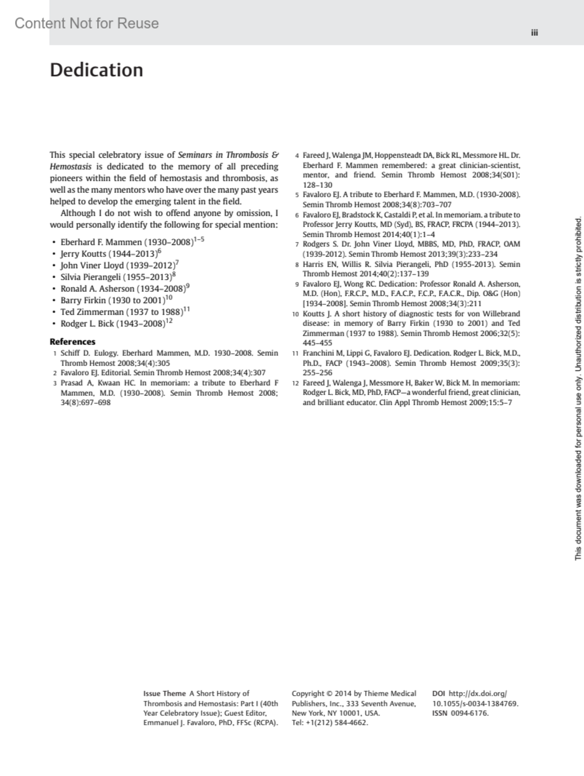 DedicationSeminars in Thrombosis & Hemostasis 40(5):p iii, July 2014. | DOI: 10.1055/s-0034-1384769Copyright © 2014 by Thieme