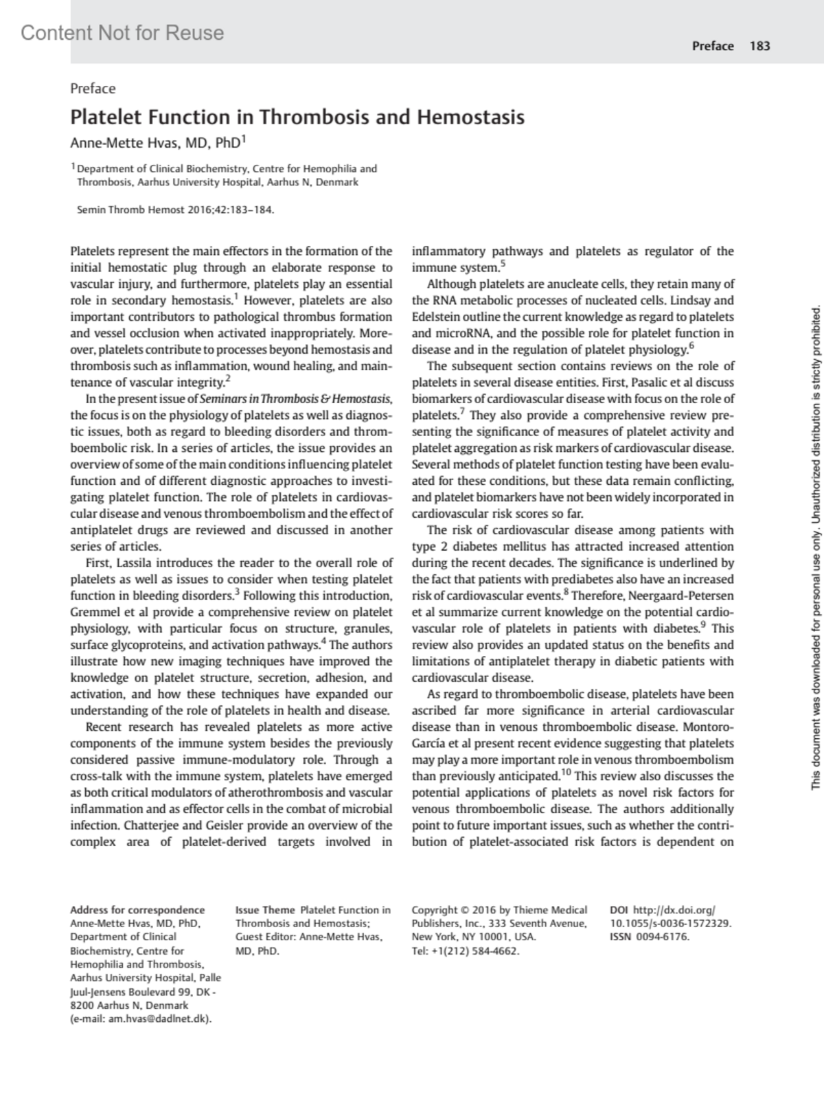 Address for correspondence Anne-Mette Hvas, MD, PhD, Department of Clinical Biochemistry, Centre for Hemophilia and Thrombosis, Aarhus University Hospital, Palle Juul-Jensens Boulevard 99, DK - 8200 Aarhus N, Denmark (e-mail: [email protected]).