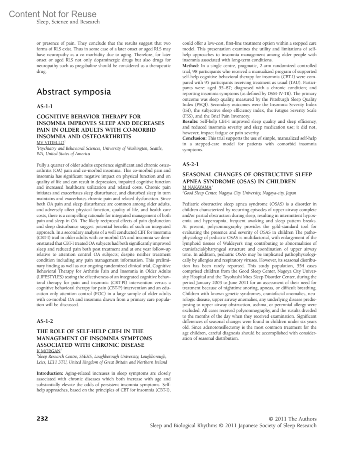 Sleep and Biological Rhythms 9(4):p 232, October 2011.