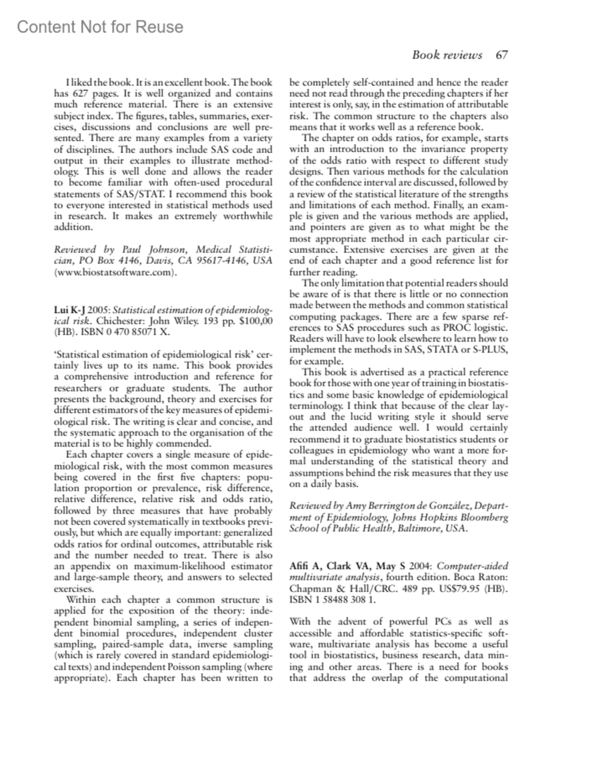Computer-aided multivariate analysis, fourth editionMartinez, Angel R.Author information1Department of Mathematics, Strayer University, Fredericksburg, Virginia, USAStatistical Methods in Medical Research 16(1):p 67-68, February 2007. | DOI: 10.1177/09622802070160010604Copyright ©2007Sage Publications