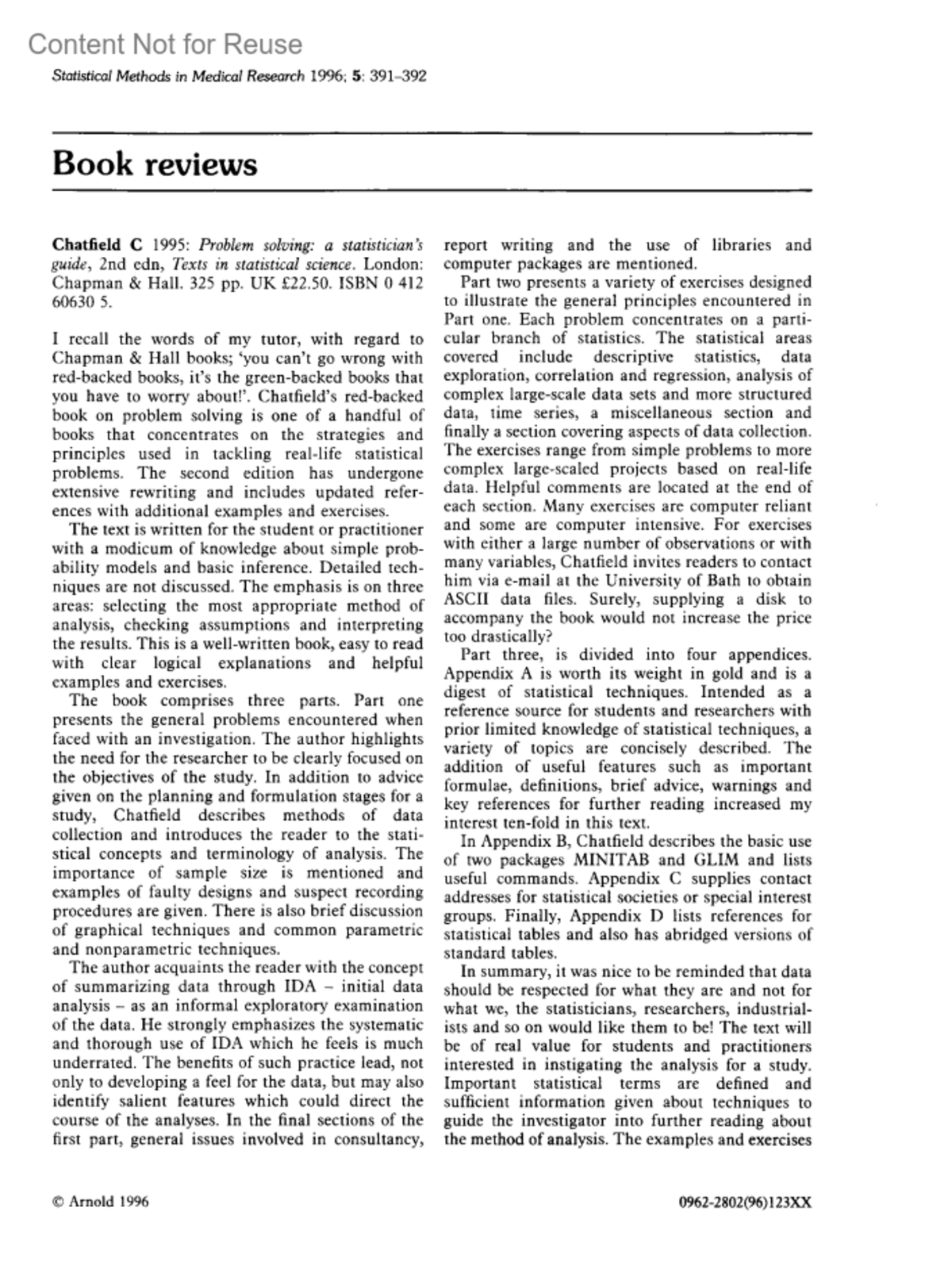 Statistical Methods in Medical Research 5(4):p 391-392, December 1996. | DOI: 10.1177/096228029600500405