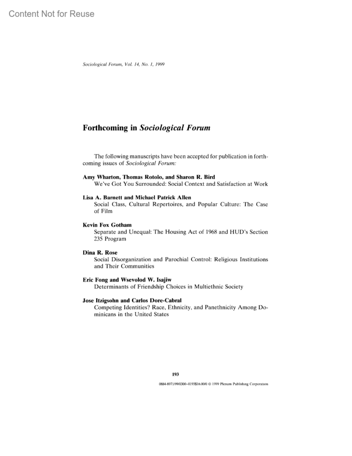 Forthcoming in Sociological ForumSociological Forum 14(1):p 193, March 1999.Copyright ©1999 Kluwer Academic Publishers