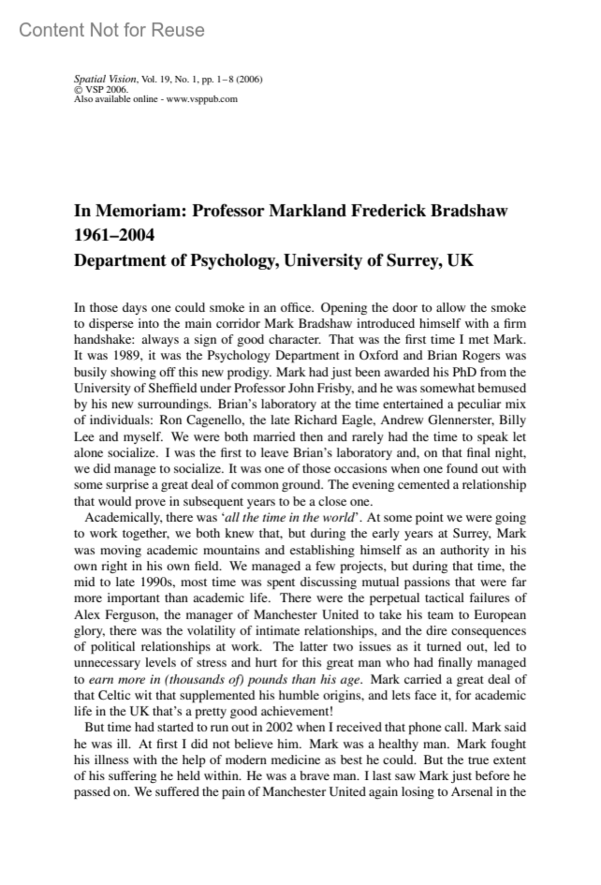 Professor Markland Frederick Bradshaw 1961–2004Department of Psychology, University of Surrey, UK