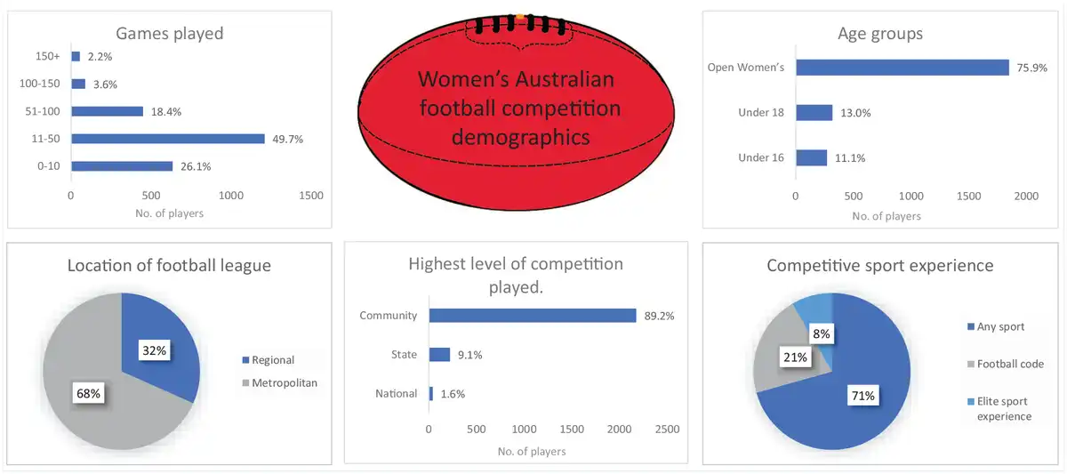 Women’s and girl’s participation in Australian Football (AF) has increased dramatically since the inception of the Australian Football League Women’s (AFLW) elite competition in 2017. Between 2016 and 2018, women’s community club teams grew by 137% (960 teams to 2281 nationwide),, women participants grew by 87% between 2015 and 2022, and women made up 31% of all participants in 2022., The AFLW competition is now Australia’s largest employer of women athletes. This rapid evolution is exciting and significant for Australian women’s sport but has been accompanied by media attention and concern around the risk of significant knee injuries and concussion for women playing AF.,, Despite much speculation and assumption that these rates are similar for women playing community AF, we know little about their injury profile.