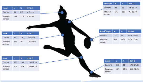 Most common self-reported current and previous serious injury prevalence by body region. See Table 1 in Appendix 3 for all regions prevalence (available online).